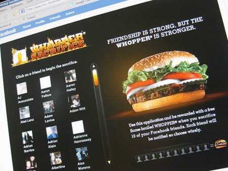 WHOPPER Sacrifice, an advertising campaign from Burger King rewarded Facebook users a free “Angry Whopper” for deleting 10 friends, who would then receive a blunt message informing they were deleted for a free hamburger. The campaign, conceived by Burger King agency Crispin Porter + Bogusky and executed by Refresh Partners, used the tag line “Friendship Is Strong, but The Whopper Is Stronger.” Until now, the application had been downloaded more than 55,000 times and over 250,000 ‘friends’ were sacrificed.