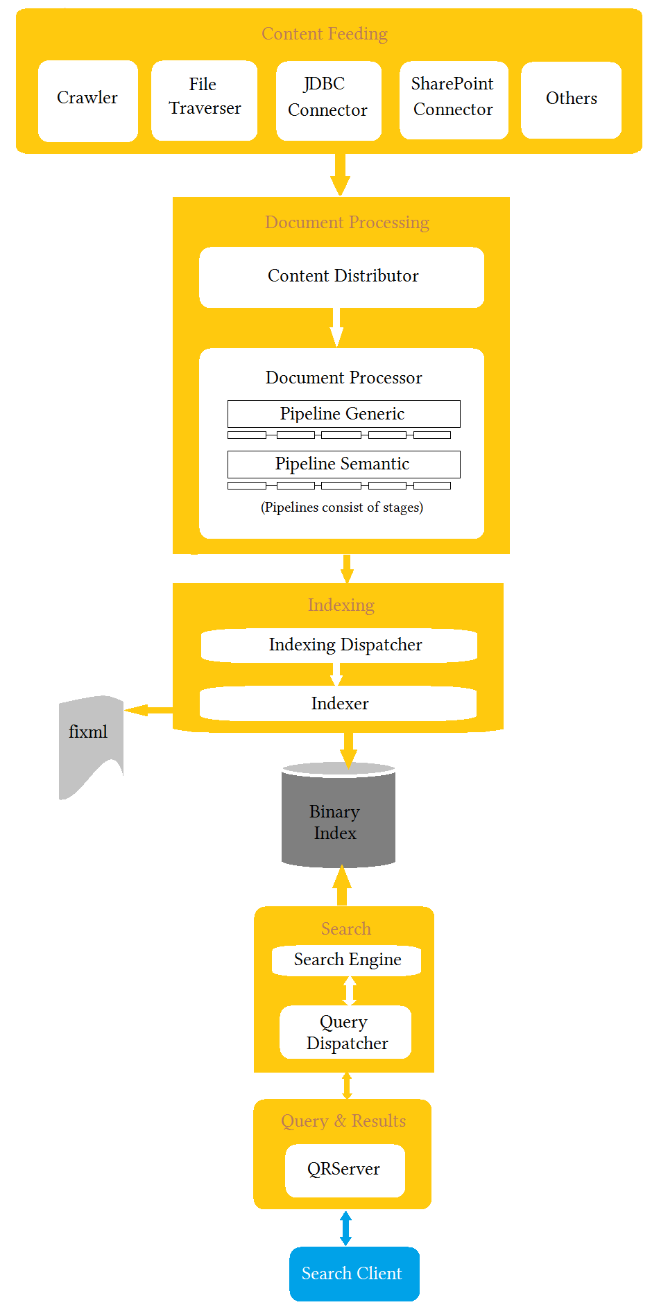 In this stage, content that has been processed would be stored as stored as binary index. Also it should be noted that fixml would also be created at this point which acts as a back-up for the binary index. fixml would also help us find out how the documents have been indexed i.e. what fields have been indexed and whether linguistic rules had been applied while indexing them or not and so on. Should there be any inconsistency within the binary index, it can be rebuilt with the help of the fixml without having to re-index the data.